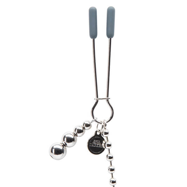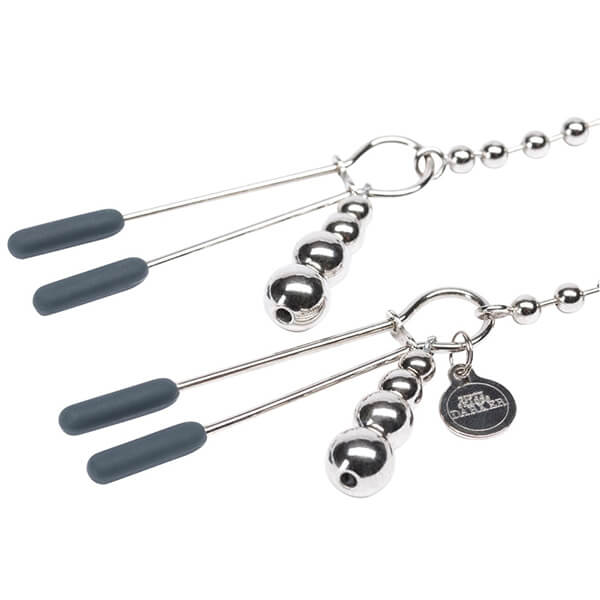Når det kommer til elegante brysklemmer er At My Mercy fra verdenskendte Fifty Shades of Grey i en klasse for sig selv. kæden består af flere små kugleled, der giver kæden ekstra god bevægelighed, så den virkelig kan ses og mærkes under leg med brystklemmerne. Spidserne på brystklemmer har en silikonebelægning, der gør at de sidder ekstra skånsom om brystvorterne. Det er muligt at justere styrken af klemmerne ved at skubbe låsen op eller ned. I hver af brystklemmer sidder 4 kugler, det giver en ekstra pirrede nydelse ved bevægelse.